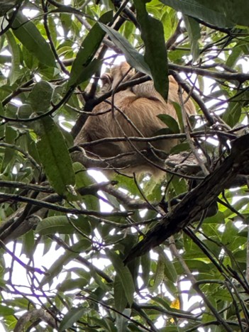 Interestingly, there were also a great deal of animals who came by to visit the protected animals that were in cages. It was nice to finally see a sloth, and there were several here in the “free” area, but they were still at the top of the trees and appeared as a big brownish lump. Must’ve been nap time (which I gather is most of the time for them!)