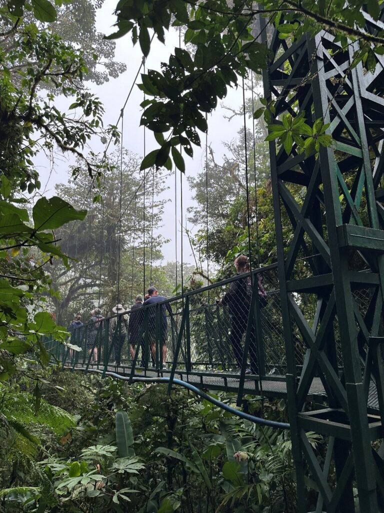 The Monteverde Cloud Forest Reserve is nearby and is more popular, but the St Elena Reserve was not crowded and was a pleasure to go through. It was great to start at ground level and identify the plants and then move up to the spanning walking bridges over the trees and get the view from above. We were treated to a sunny, but cloudy day, so some of the clouds were low and hanging over the tree tops and we passed through some of them!